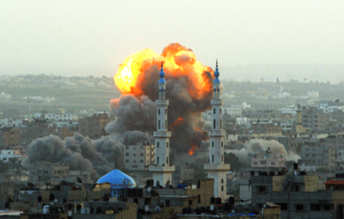 Smoke rises during an explosion from an Israeli forces strike in Gaza City, Saturday, Nov. 17, 2012. Israel bombarded the Hamas-ruled Gaza Strip with nearly 200 airstrikes early Saturday, the military said, widening a blistering assault on Gaza rocket operations by militants to include the prime minister’s headquarters, a police compound and a vast network of smuggling tunnels. (AP Photo/Hatem Moussa)